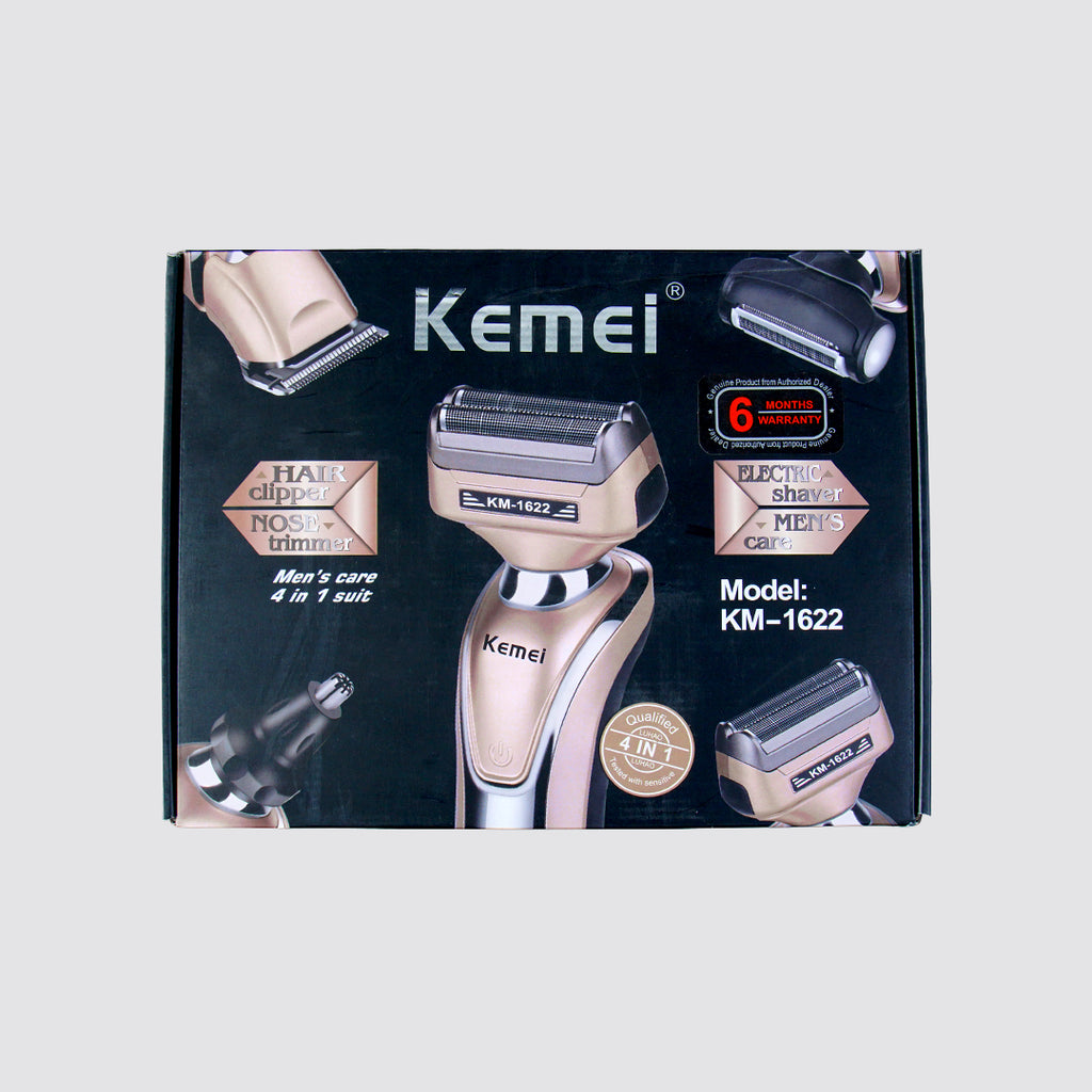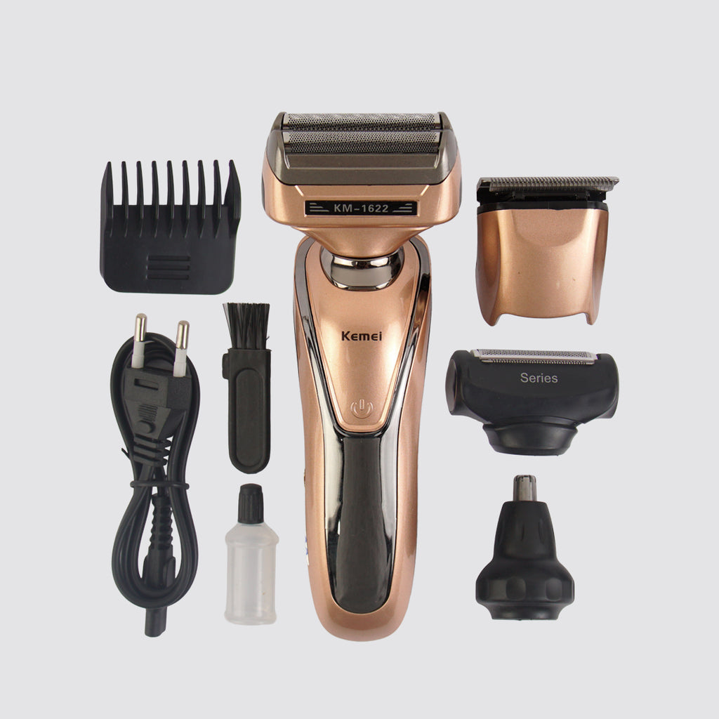 Box includes: 1 Kemei KM-1622 unit, 1 shaver, 1 trimmer head, 1 nose trimmer, 1 oil bottle, 1 cleaning brush, 1 charging unit, user manual, and warranty card .