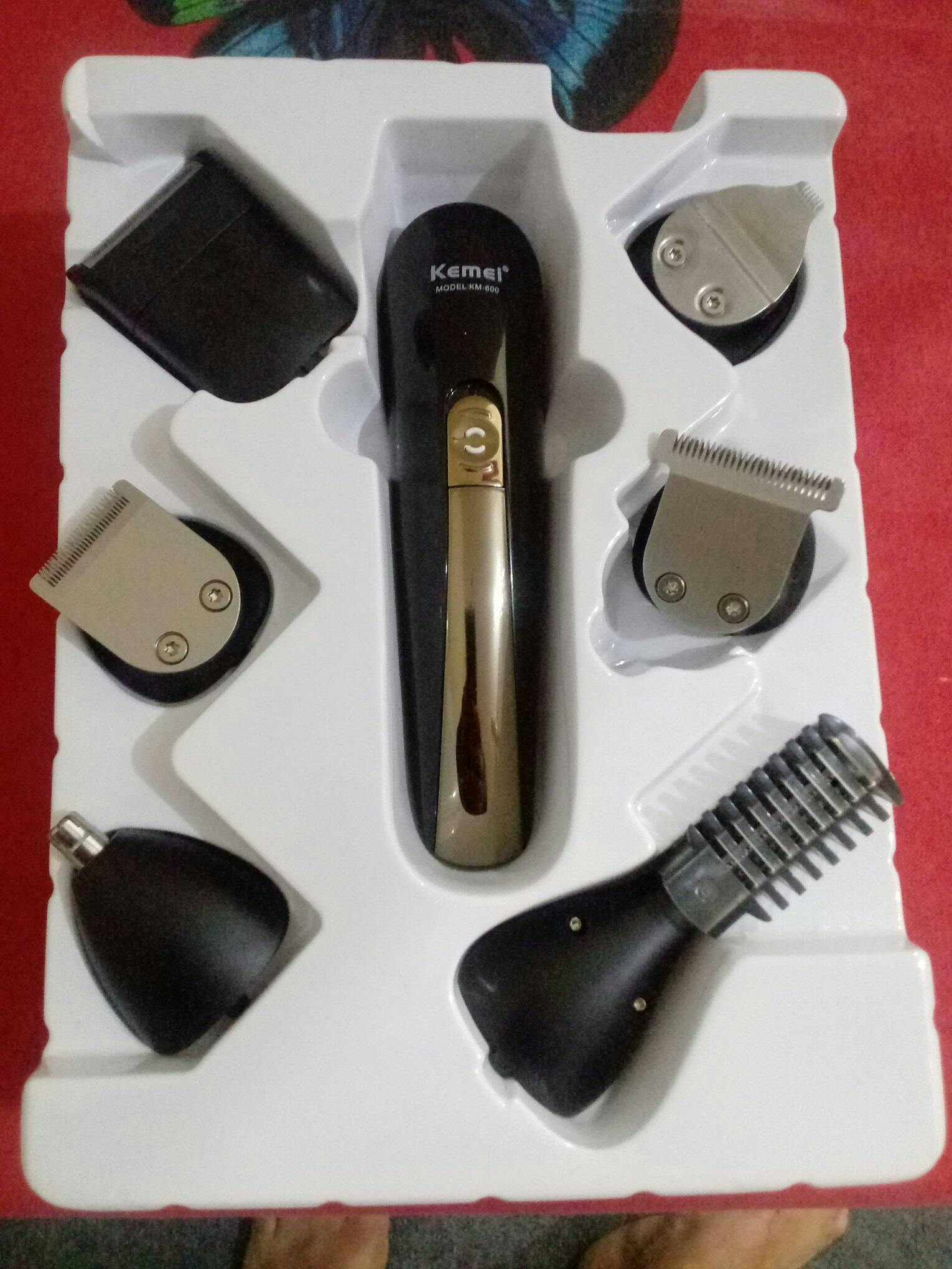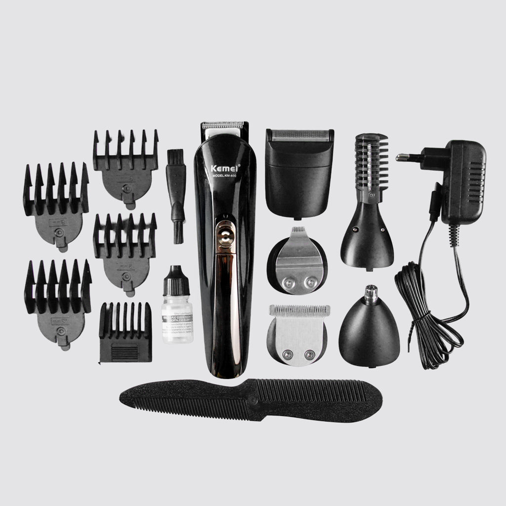 Box includes: Kemei KM-600 main unit with precision head,1 full size trimmer,1beard designing trimmer,1 nose trimmer, 1 shaver, 1 body trimmer,(3,6,9,12mm limit combs), 1 moustache trimming comb, 1 Manual, 1 Cleaning Brush,1 maintenance oil, 1 Beard Comb, and warranty card